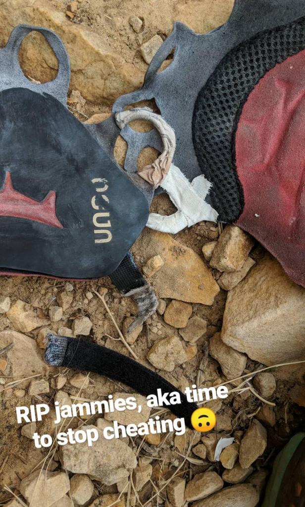 After aiding up the crack to figure out the sequence at first, I launched up it for a redpoint attempt. I successfully scrapped my way through the crux, and went to throw for a tight hand jam just below the roof, only to discover that my jammie had torn, and now hung loosely from my hand like a flag blowing in the wind. Every time I tried to shove my hand into the crack, the fabric caught and prevented me from sticking the move. I quickly pumped out and fell, cursing my luck. I taped it back together and fired the route next go for a proud number 100, only to have my jammie rip again when I degloved back on the ground. After so many adventures together, I couldn’t help but wonder if it was a sign that I should finally retire them.