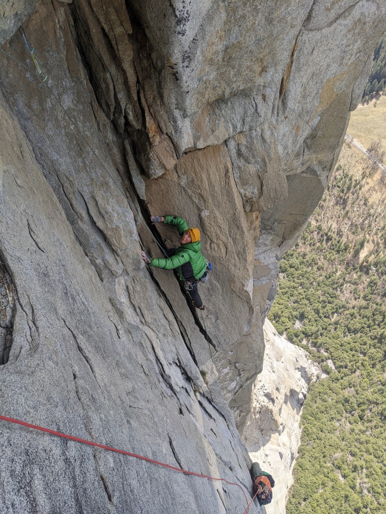 Wet hand jams turned to wet fingerlocks, before the crack eventually sealed shut and I entered a wide stem under a looming roof. I knew the beta here, I had watched the Huberbaum video of it countless times. That was, except I couldn’t seem to reach the holds he had used. I twisted this way and that, trying to find a way to escape the elevator shaft until something clicked. A strange understanding of body geometry and the faint memory of a passing comment from Elliot: backwards. I delicately spun myself around until I was facing away from the wall and out towards Yosemite Valley, two thousand feet below. From that position I was able to reach a thankfully dry hand jam, cut feet, and spin around once more into a more normal climbing position to finish the pitch. Just like that, hope was once again restored.