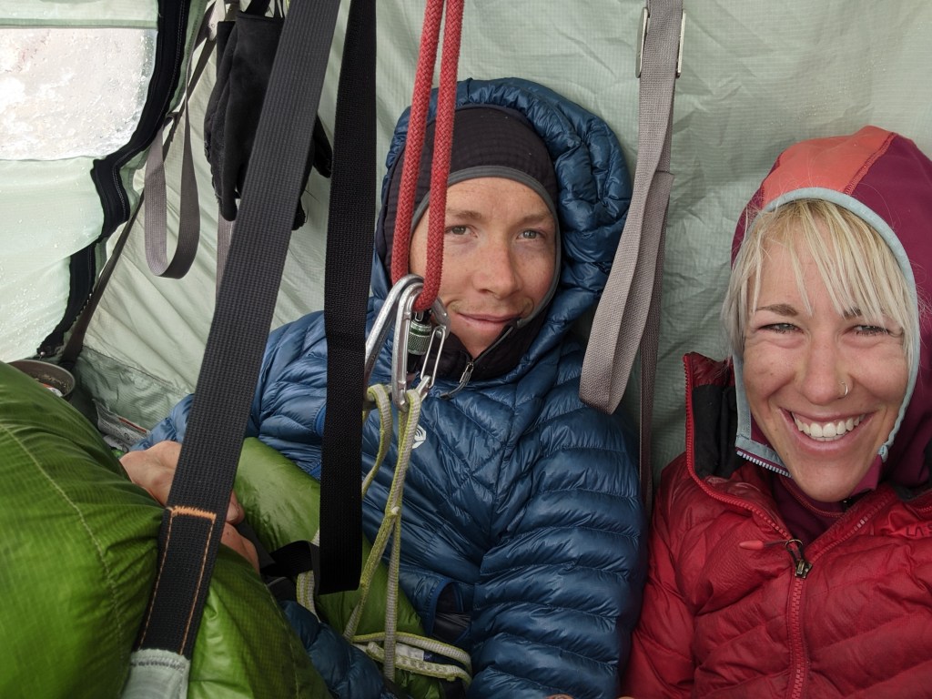 The Belgians had reached our camp by now, setting up their portaledge on the other end of the narrow ledge. Seb and Soline had been on the wall almost as long as we had, through the first storm as well. They were on a much smaller portaledge, with a much less waterproof rain fly, had lost one of their sleeping pads, and yet despite their hardships they were in high spirits and fully believed they would complete the route. Their psyche made us believe in the impossible as well, because they were so unphased by the elements. Just this one more storm and the next two or three days promised to be not only sunny, but the warmest it had been in a week.