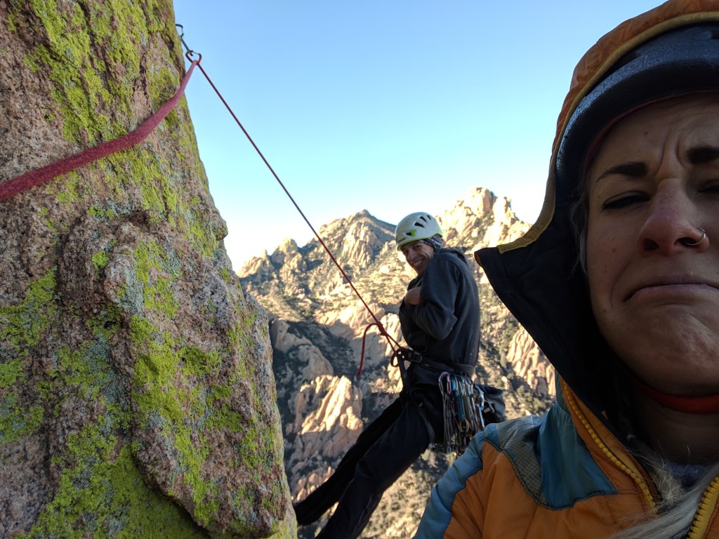 Cochise is an adventurous place, and I quickly found the climbing there to be a bigger step outside my comfort zone than I was ready for at the time. The approaches are long, steep, and confusing. The conditions seem nice at camp, but at the end of the hike you crest over a hill and are suddenly exposed to relentlessly bitter winds, all day, every day. Most of the climbing is multipitch. While nowadays I love long routes, am not afraid of bad conditions, and am tougher than any approach, back then that was not the case, and I quickly began to feel very much in over my head.