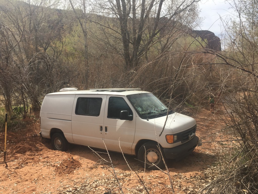 Jeff should be in the Cottonwoods by now. Looking at a poorly rendered no-signal version of a map, I concluded that I was about a mile and a half away. I jogged back to find him, and explained the situation. There was an Access Fund trail crew camp nearby that we stole a shovel from, and quickly returned to my hopeless van. I thought with a shovel and a second set of hands we would be able to dig me out no problem, but no matter what we tried, nothing seemed to work. Every log or rock we put under my tires just got pushed deeper into the sand. Eventually, the sun began to set and we knew we had to wrap up our efforts for the night.