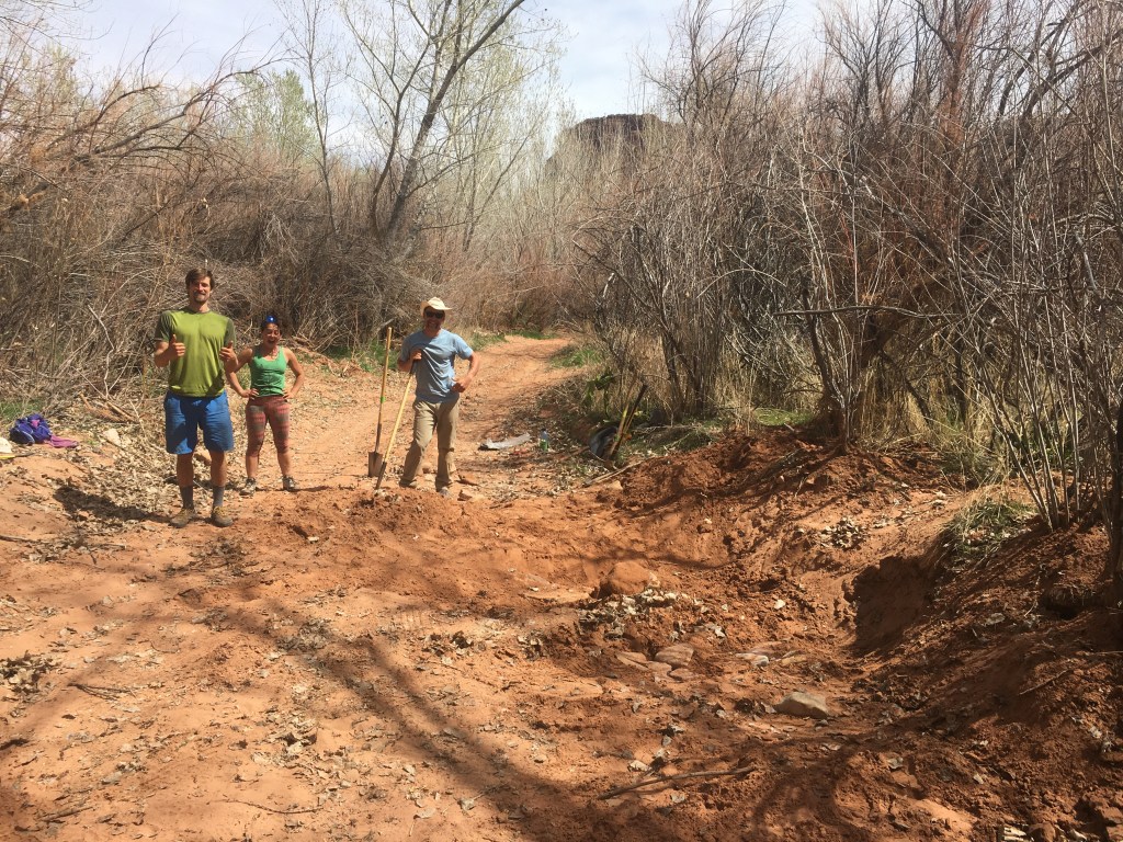 The next day the four of us swung by the Access Fund site once more, where they had left us a nice note and a few more pitchforks and shovels. With eight strong climber hands, we shoveled sand for almost an entire day. With the tires finally free, we managed to put chains around them, and lined the road with half the rocks in the riverbed. With a mighty push from everyone, at last my van broke free.