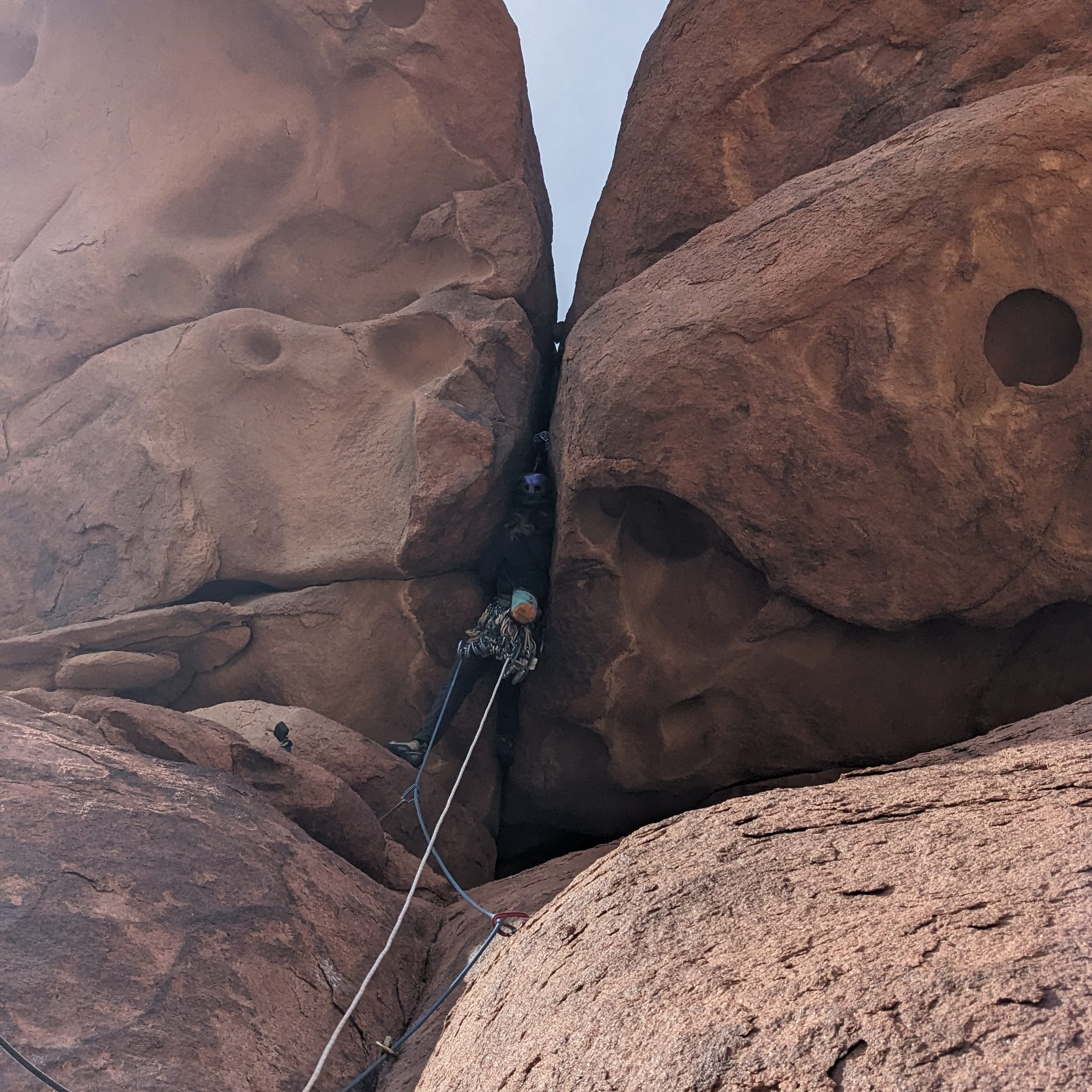 The route followed an existing old trad climb for the first pitch, before venturing into new terrain where a number of bolts were required to navigate a technical flare. That brought us to the short, wide roof, that presented a different challenge for each one of us thanks to our varied sizes of hands, arms, and legs. Mary styled through it first with hand fist stacks and chicken wings, before it was my turn. As I racked up for the next go, Mary offered to let me borrow her crack gloves since I’d forgotten mine and the backs of my hands were already bleeding from some disgustingly flared hand jams I’d used on the previous pitch. I miraculously managed to fit most of my extra-large hands into her extra small gloves, but the inflexible leather somewhat limited my movements. It was a sacrifice worth making to save my skin, but the result was that I could not follow the route in her same style since I couldn’t quite make a fist with the restrictive gloves. After sliding out in frustration, I reconsidered my options and decided to try and invert. After nearly ten minutes of groveling for a few inches of upward progress out the very short roof, I finally managed to right myself, succeeding in climbing my first 5.12 offwidth. Sam went last, opting not to use Mary’s crack gloves and succeeding in using the fist jam I could not, and was at the chains before he even broke a sweat. Thus in one afternoon we established Egypt’s hardest crack climb, a record that would almost immediately be broken just one day later by Mary.