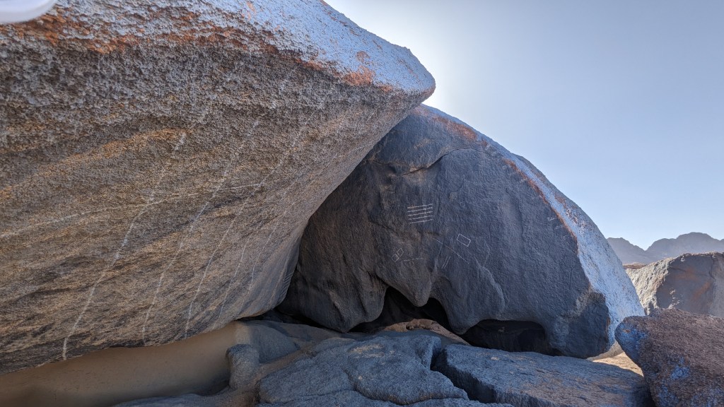 Now connected to the small yet tight-knit community, the next day we piled our heavy loads of drills, bolts, ropes, and camping gear into a few cars and headed out towards the mountains for the real reason we were here. While 95% of Egypt’s population lives along the Nile river and its delta, where we were going was Sinai, the peninsula that acts as a land bridge between Africa and Asia (and is the part of the latter that makes Egypt a trans-continental country). To get to Sinai requires crossing the Suez Canal via a tunnel that gets treated as seriously as an international border, with numerous police checkpoints at which we were required to stop and have our passports inspected. We were told to simply say we were going on a hiking trip if questioned (a popular source of tourism thanks to the historic and religious significance of Mount Sinai, where in the Bible Moses received the Ten Commandments from God), and that if the climbing gear was found we might not be allowed through, since they are likely to simply reject that which they do not understand, but no such conflict happened.